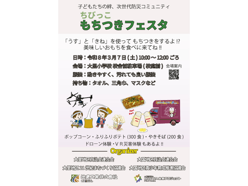 大里地区21世紀まちづくり協議会の主催「ちびっこもちつきフェスタ」に弊社および一般社団法人KIZUNA未来プロジェクト、大国地区青少年育成推進協議会が企画・準備から参加いたしました。 弊社およびKIZUNA未来プロジェクトでは焼きそばブース、ふりふりポテトのキッチンカー、ドローンVR・災害3DVR体験ブースを出店いたしました。