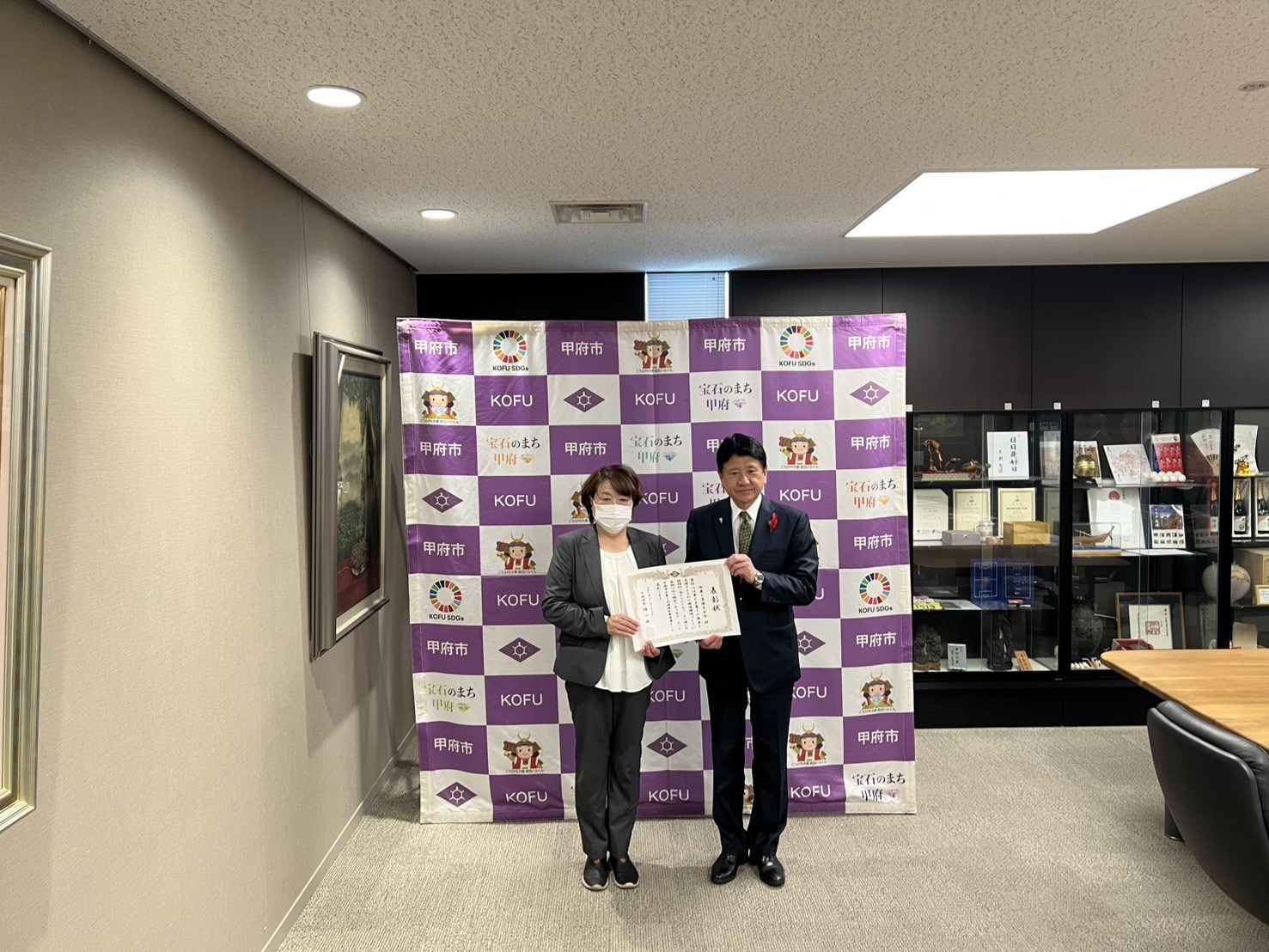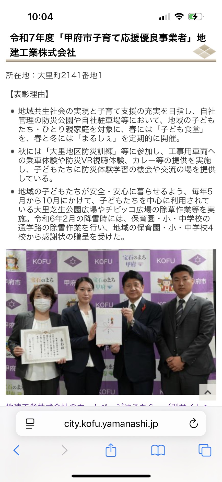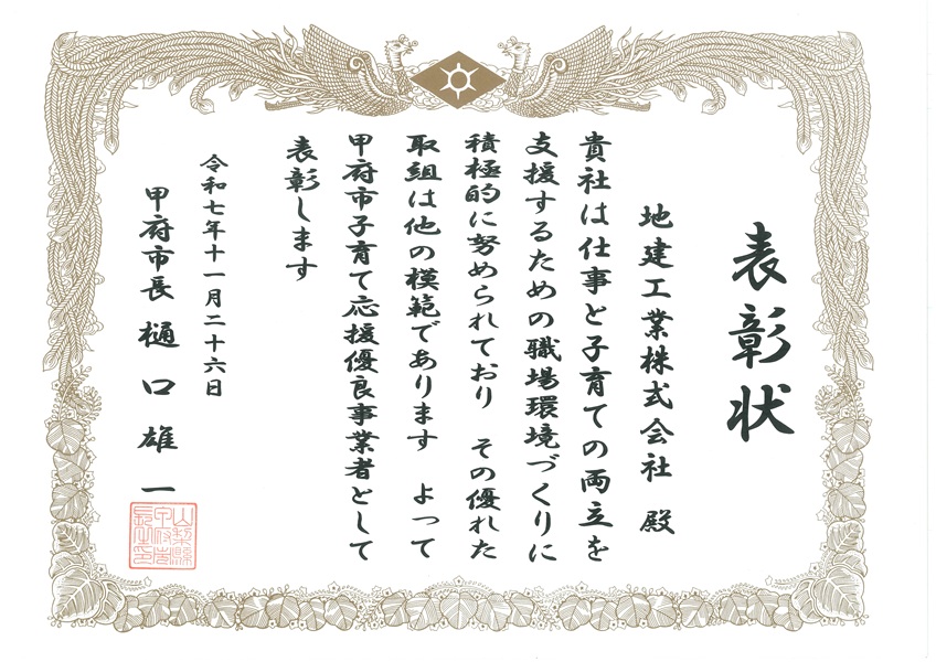 弊社は令和7年度「甲府市子育て応援優良事業者」として表彰されました。