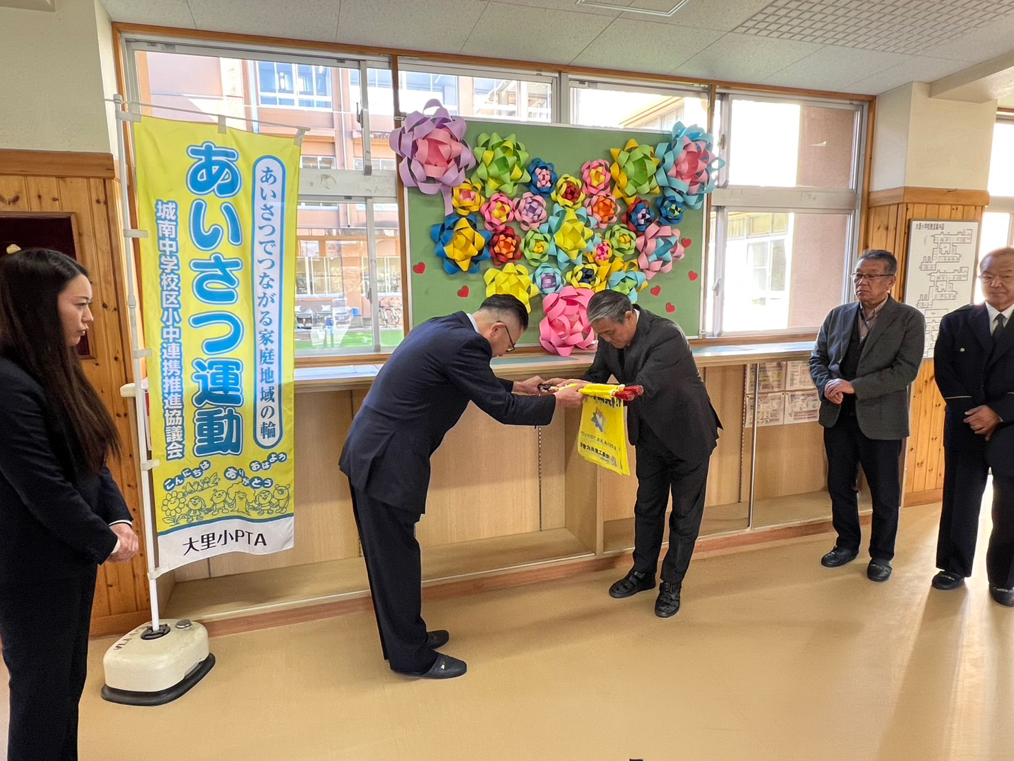 そこで、大里小学校の児童の皆様が、より安全に安心して登下校できることを願い。交通安全と防犯活動の一環として警笛つき横断旗を寄贈させていただきました。