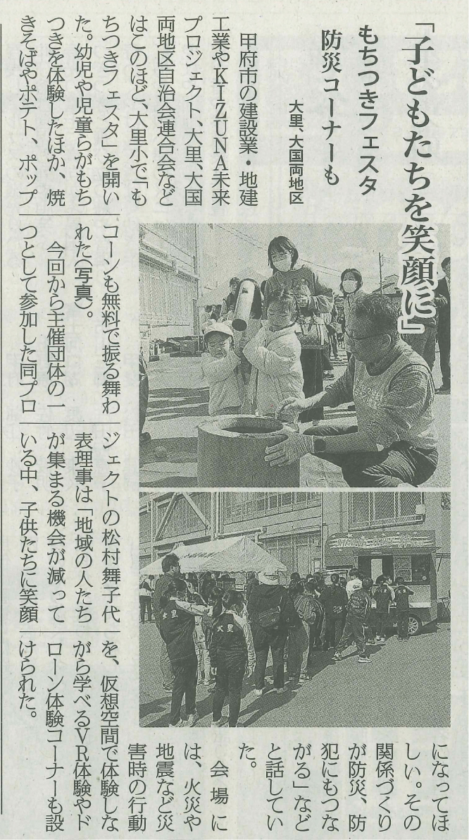 大里地区21世紀まちづくり協議会の主催「ちびっこもちつきフェスタ」に弊社および一般社団法人KIZUNA未来プロジェクト、大国地区青少年育成推進協議会が企画・準備から参加いたしました。 弊社およびKIZUNA未来プロジェクトでは焼きそばブース、ふりふりポテトのキッチンカー、ドローンVR・災害3DVR体験ブースを出店いたしました。